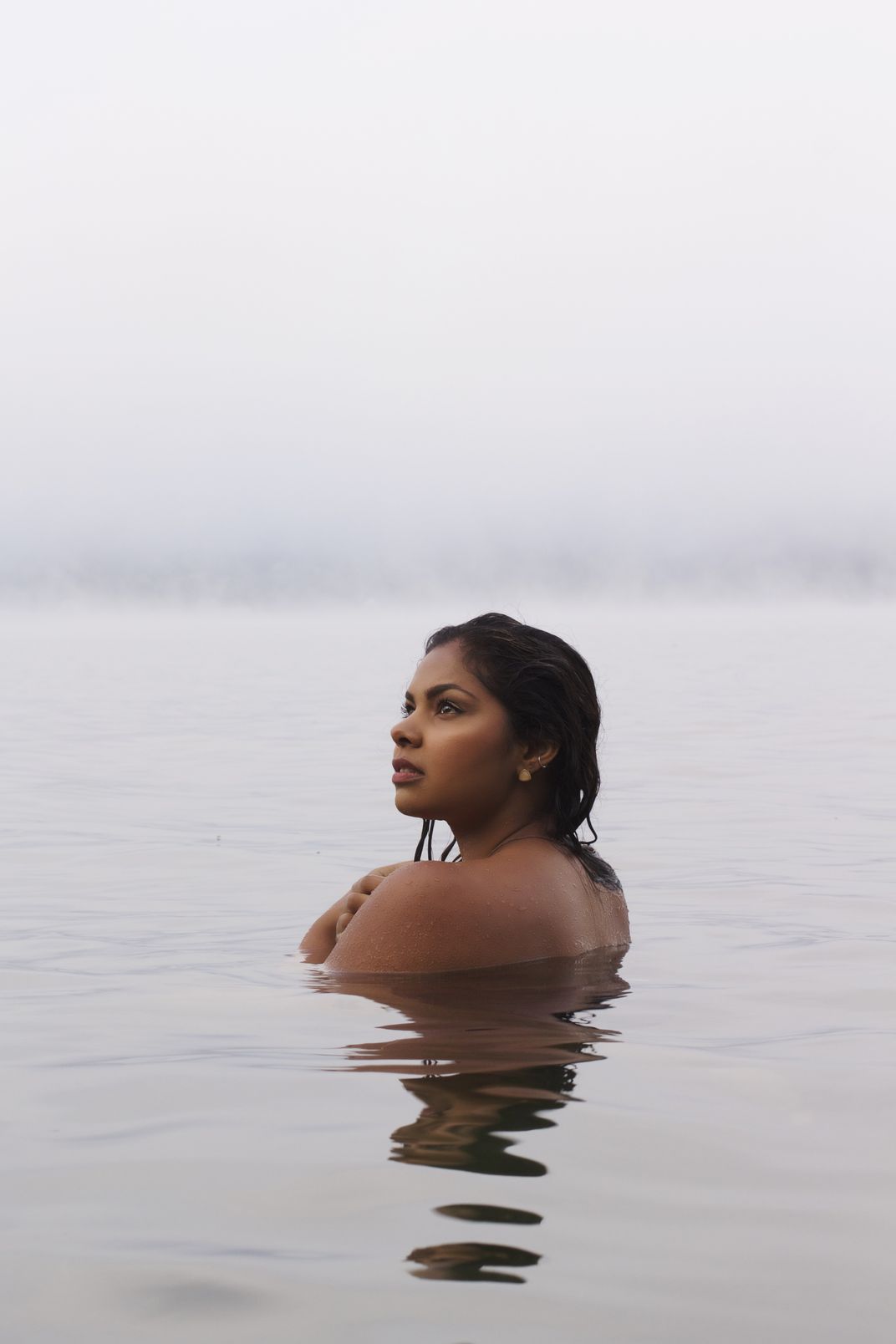A photo of my dear friend from Oxford University, Aspen Plummer, wading in the water of Washington Lake in the early morning amidst the fog - capturing the beauty of the subject and the nature of the Pacific Northwest in a collaborative piece of nature and lifestyle.