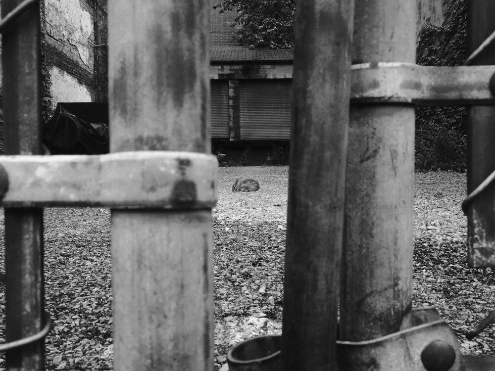 A delicate rabbit "rests" behind a rigid barb-wired "cage" after an evening rain. This monochrome exhibit lies forgotten, as if innocence itself is waiting to breathe in a place fully abandoned by the world. I tried my best to capture the raw emotion I felt as my eyes met with the rabbit's. The fencing and harsh walls draws the viewer's attention to the main focus: the juvenile bunny trying to survive off of almost nothing. This photo is meant for people to reconsider, and most importantly, to empathize.