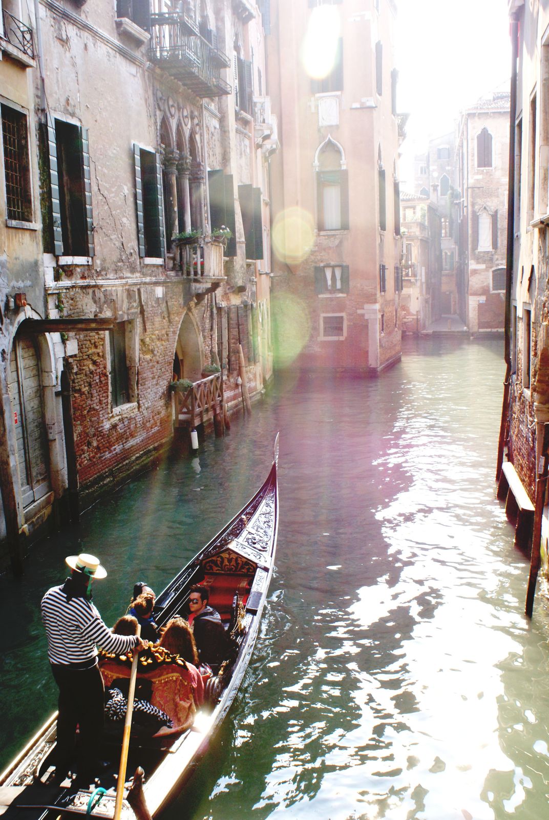 Travelers taking an early morning gondola ride in Venice, Italy.