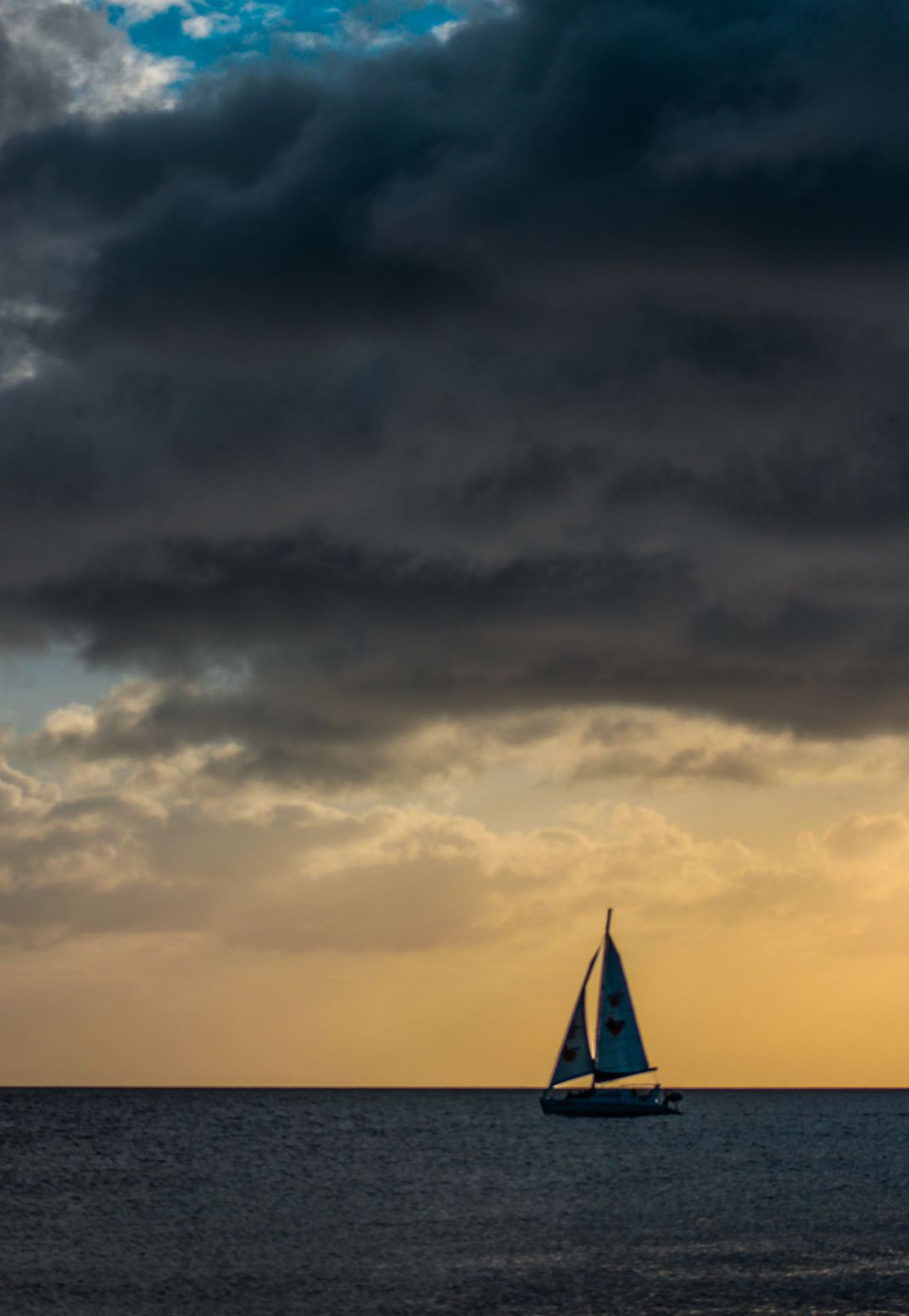 This photo beautifully captures the dark, ominous clouds as they rolled in at dusk over a sailboat making its way back to shore, trying to beat the impending storm and darkness.