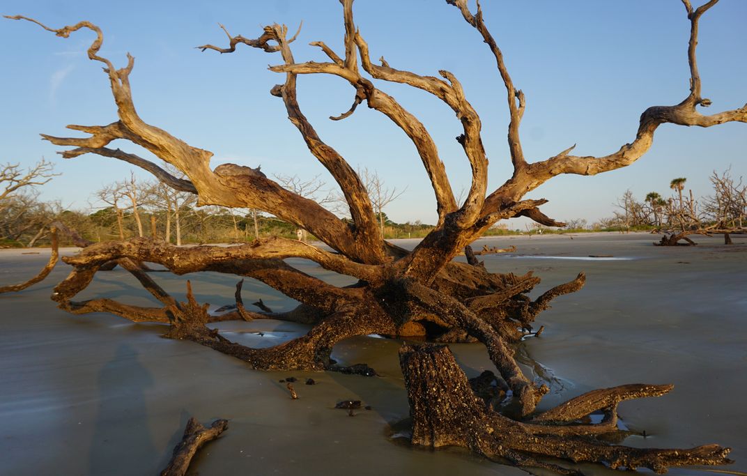 Driftwood Beach Dead tree lying on the Beach in Jekyll Island, Georgia. . The ocean is taken over some of this shoreline. The waves taken the sand from the roots of some of the trees. Some of the tree the ocean is pulling them away from the shore. As I walk this beach, I began to think about the global warming as the ocean take over the shore.