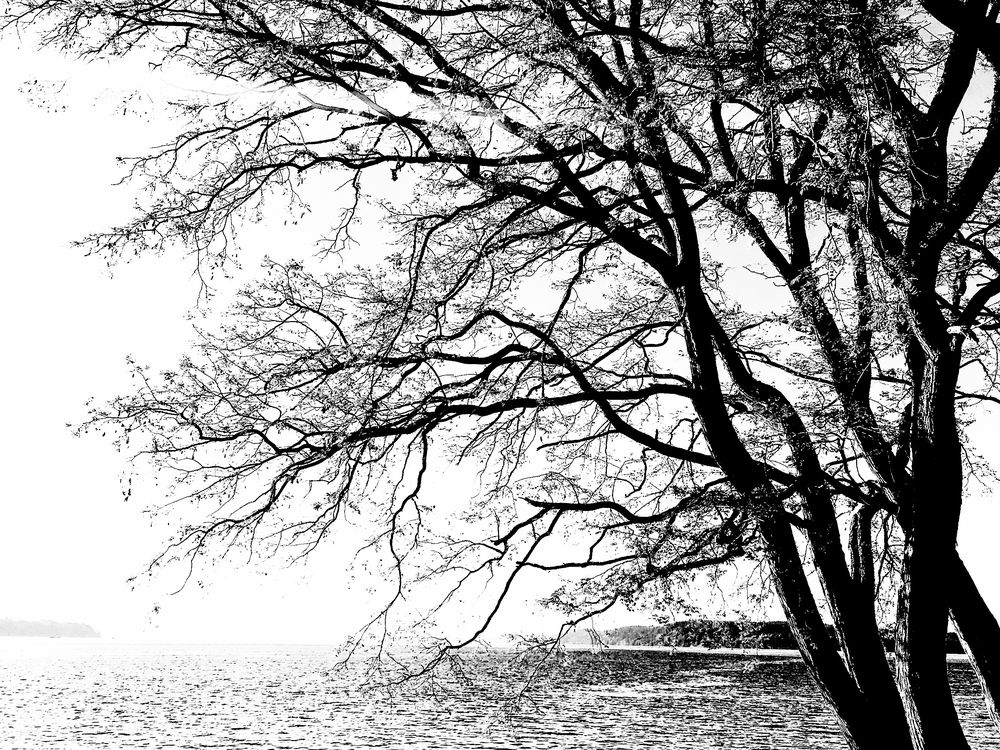 Tree looming over the Puget Sound near Lakewood. Changed to BNW w/small increase in exposure.