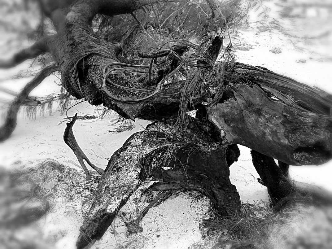 This photo shows a tree that is on a beach in Andros that was split by lighting