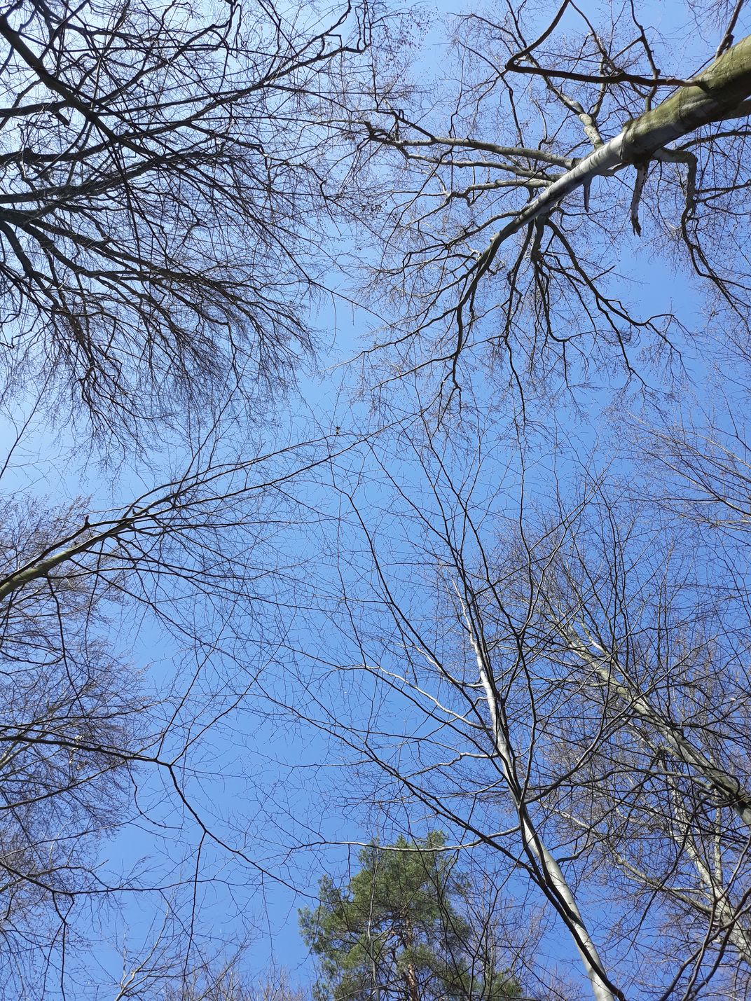 The photo shows the crowns of trees. The photo was taken in the Opawskie Mountains in Poland.
