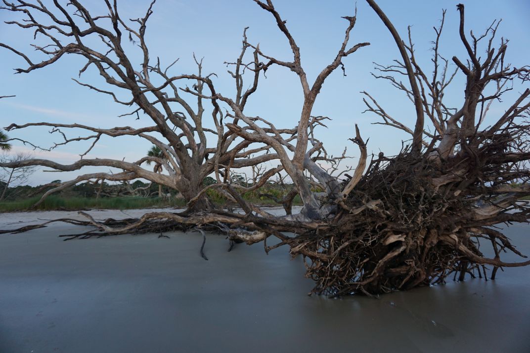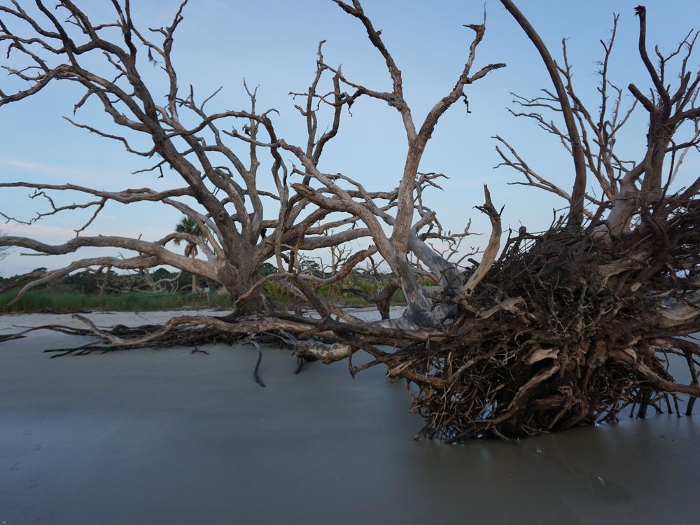 Beach in Jekyll Island, Georgia. Early morning at sunrise. The ocean is taken over some of this shoreline. The waves have taken the sand from the roots of some of the trees. Some of the tree the ocean is pulling them away from the shore. As I walk this beach, I began to think about the global warming as the ocean take over the shore.