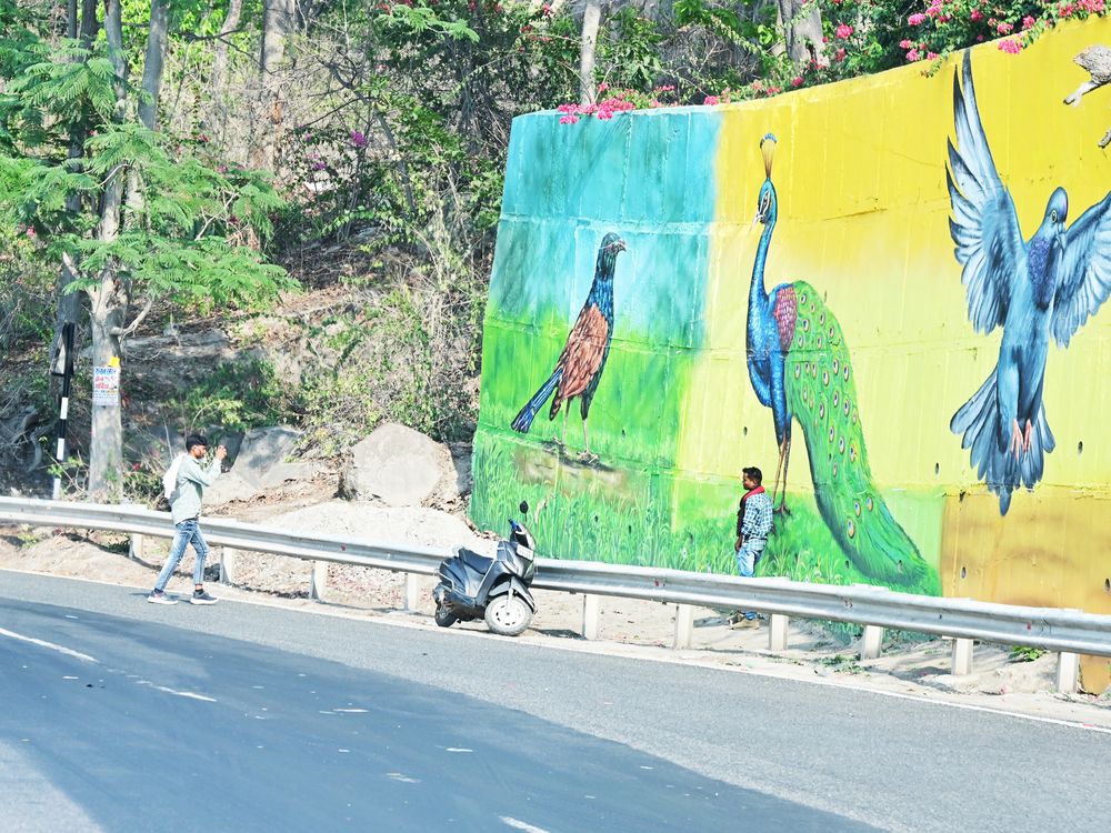 Vibrant road mural of a peacock, dove, and bird along a highway. Captured handheld, fast shutter speed to freeze action.