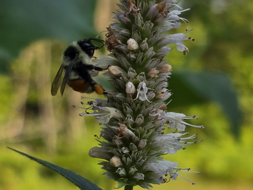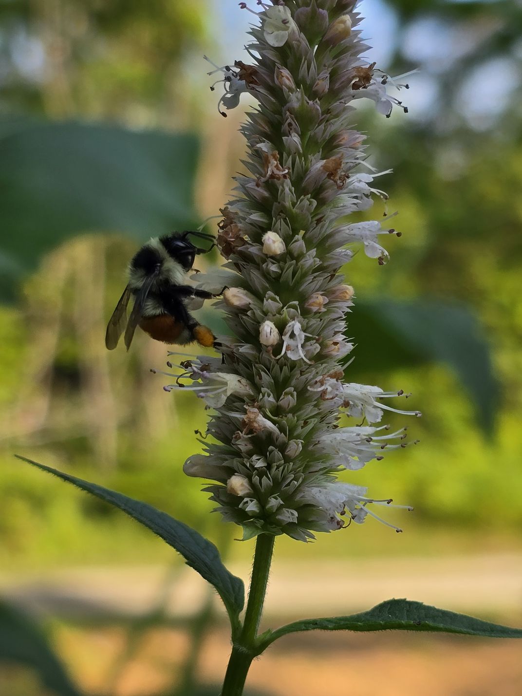The bumblers really ramp up in August every year, and this giant hyssop, agastache nepetoides, has been a big hit! It provides nutritional nectar at the end of the season, although it might not be very showy.