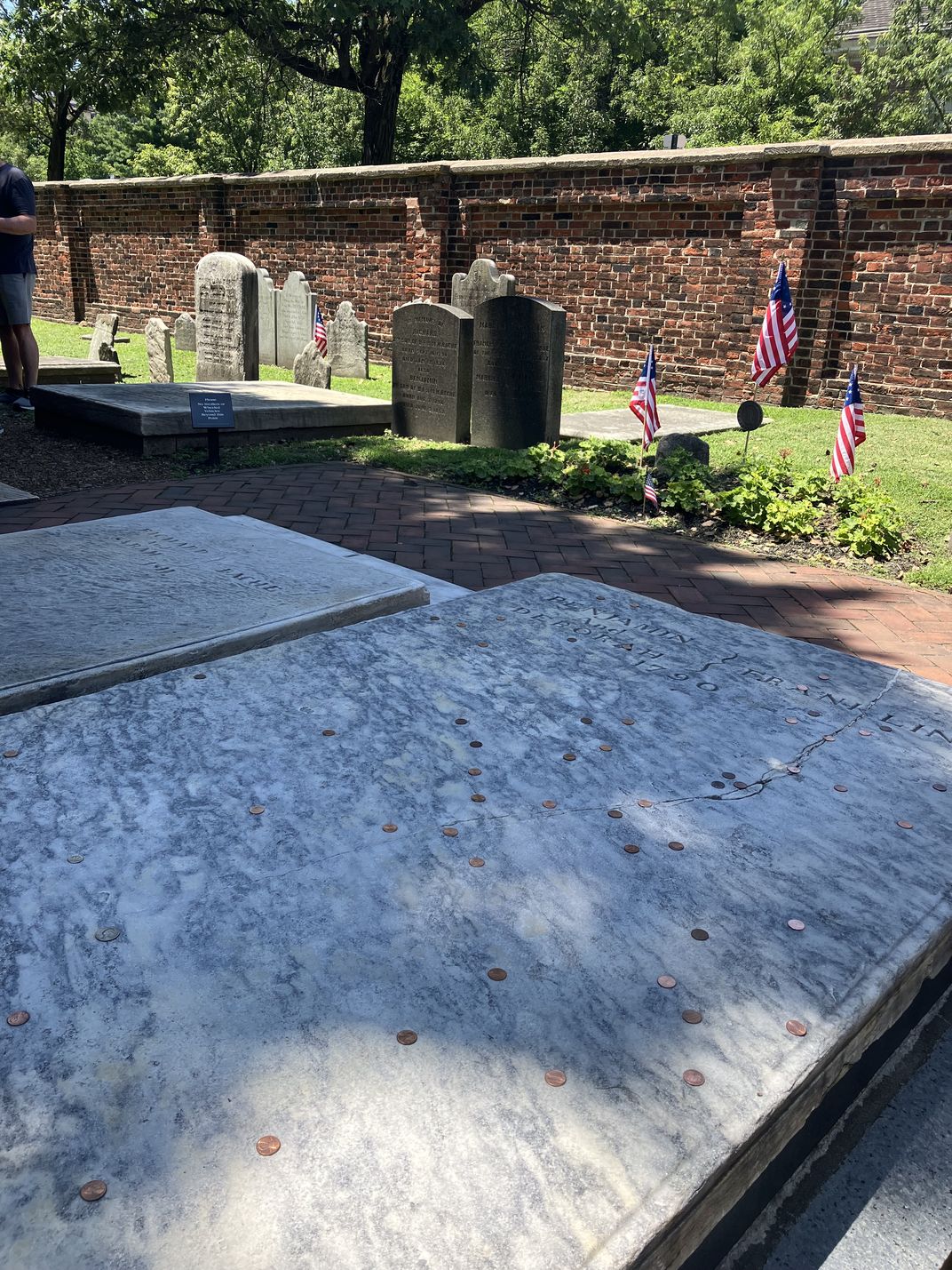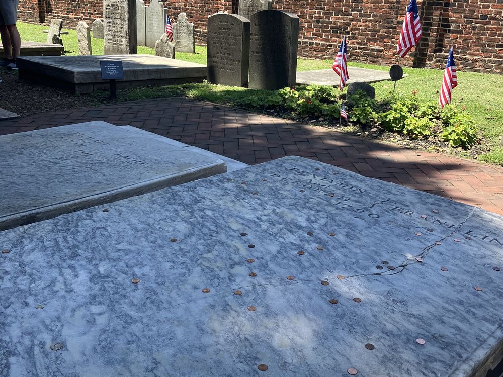 Some visitors have tossed pennies onto the grave of Benjamin Franklin, to commemorate his legacy, and for what they believe to be a token for good luck.