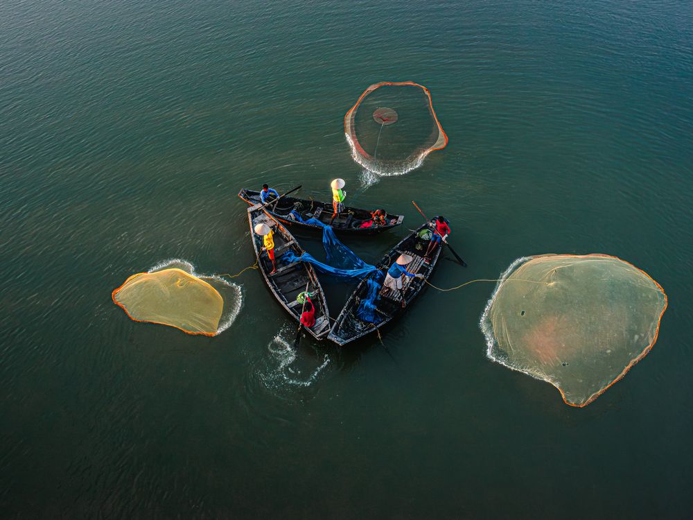 In the timeless choreography of river and nets, three boats converge in a harmonious triangle, as hopeful fishermen cast their dreams into the currents, weaving a tapestry of anticipation for a bountiful catch.