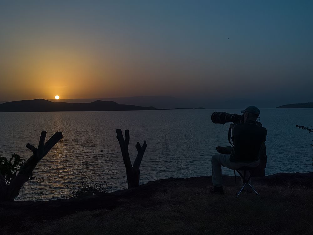 This is a tourist who is waiting for birds to be photographed in the sunrise light.