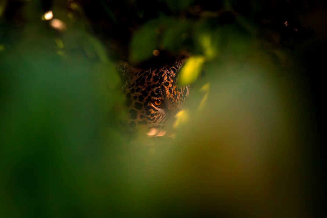 Hidden deep in the forest of the Pantanal, a jaguar reveals a single eye through the dense foliage as a beam of light touches its face. A rare moment in which the predator remains almost invisible in its own habitat.