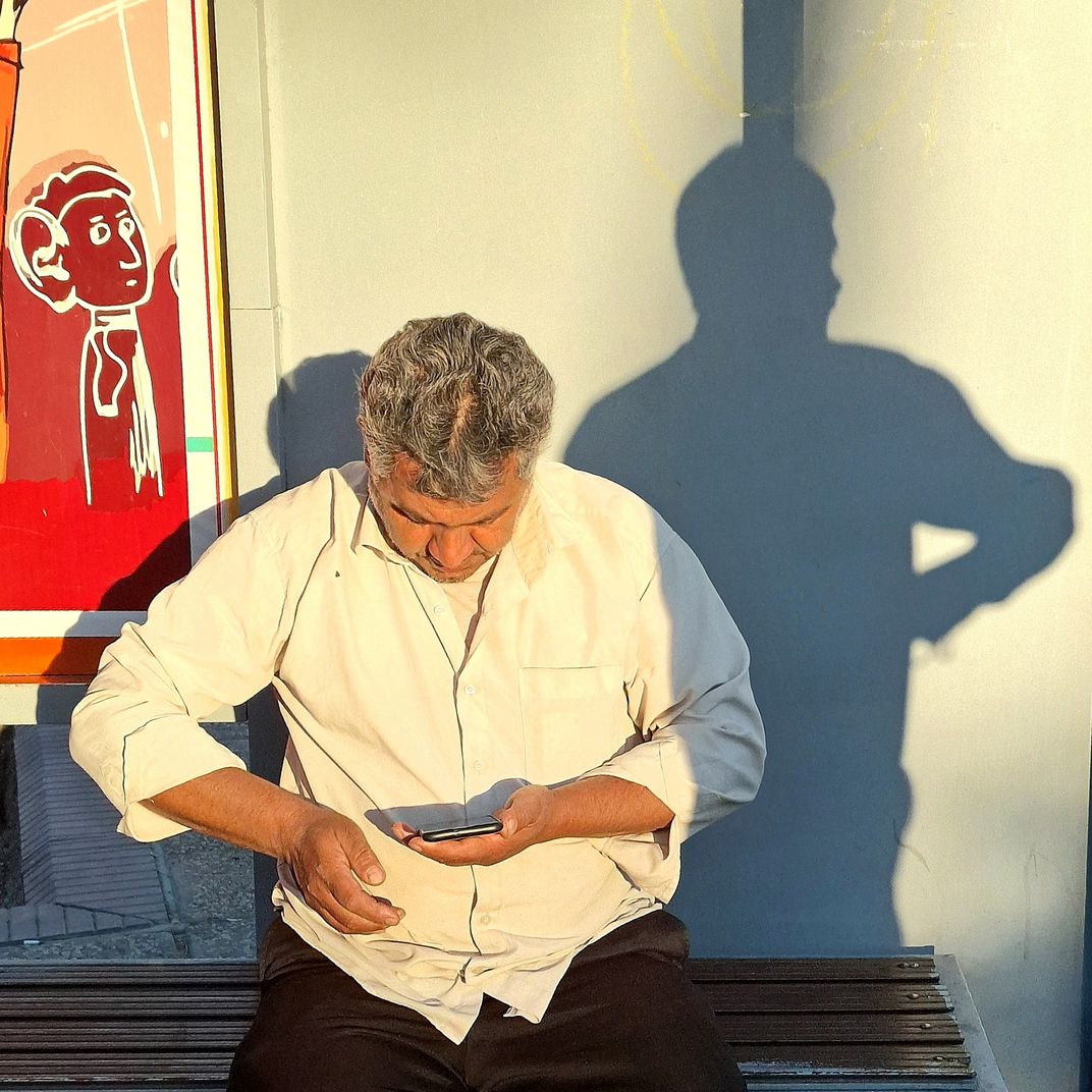 The combination of a man with his mobile phone, shadows, and a mural of the bus stop illustrates how people's true identities are often unrecognizable in the virtual world.