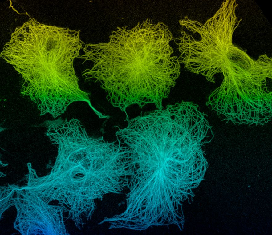 Microtubuli, essential component of cytoskeleton, are visualized in a fluorescence microscope at higher resolution in 3D. The depth is color-coded (blue-yellow)