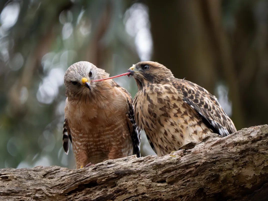 A parent Red-Shouldered Hawk feeding it's young fledging. The adult had caught a gopher for the pictured fledgling and it's two siblings. Here both birds are sharing some of the intestines in an moment straight out of Lady and the Tramp.