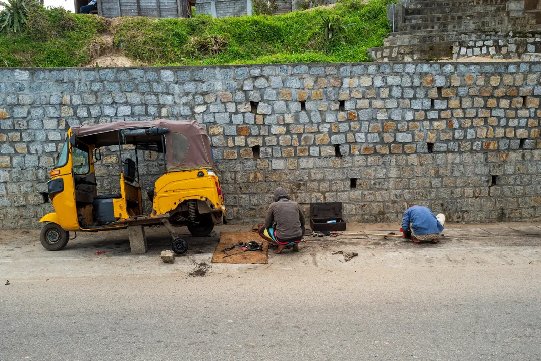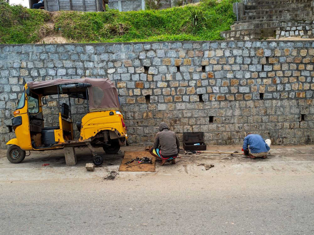 Two men fixing a Tuk-tuk, the most common means of transport in most of the Madagascan cities, by the roadside at Tolagnaro (Fort Dauphin).