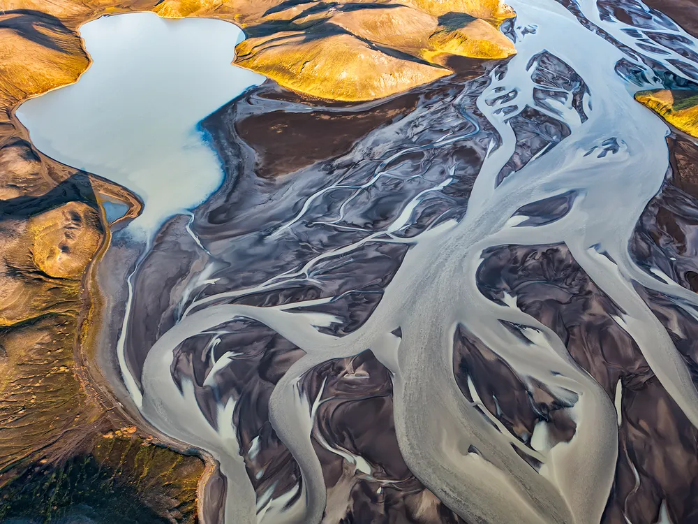 The Tungnaá is a glacial river that flows in the Highlands of Iceland. It originates from the western slope of Vatnajökull Glacier, then flows southwest until it flows into the Þjórsá river, the longest in Iceland and of which it represents the largest tributary. In this picture an aerial view taken in the Northern Fjallabak reserve in the late afternoon, when the landscape is bathed in the golden hour light. Iceland, September 2022.