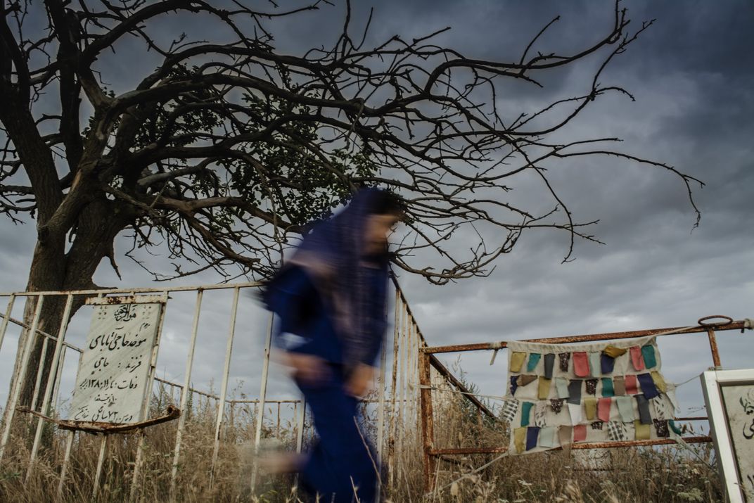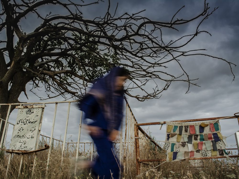 The Turkmen girl is running in the graveyard. Turkmen women do not have the right to attend the funeral.
