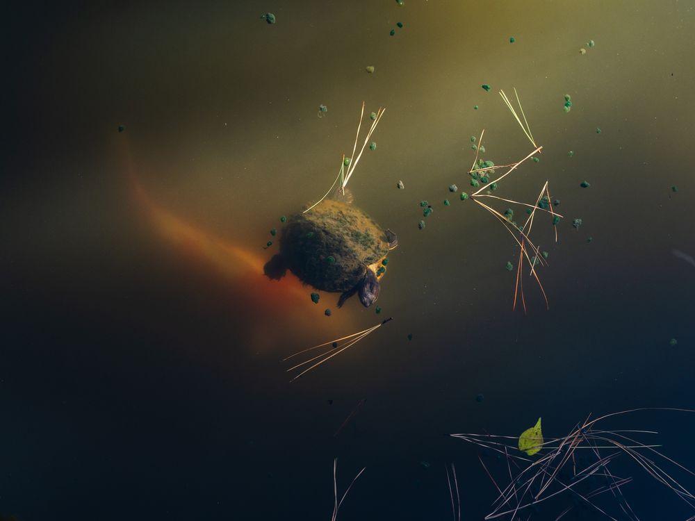 A turtle swims in a beam of light while a koi moves through the water beneath it.