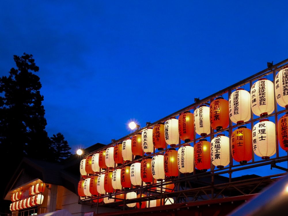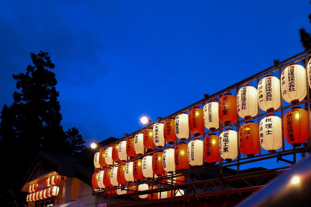 Rows of traditional glowing lanterns illuminate the evening at a temple in Tokyo, Japan. The warm orange light contrasts beautifully with the deep blue hues of the twilight sky, capturing the serene yet festive atmosphere of Japanese cultural heritage.