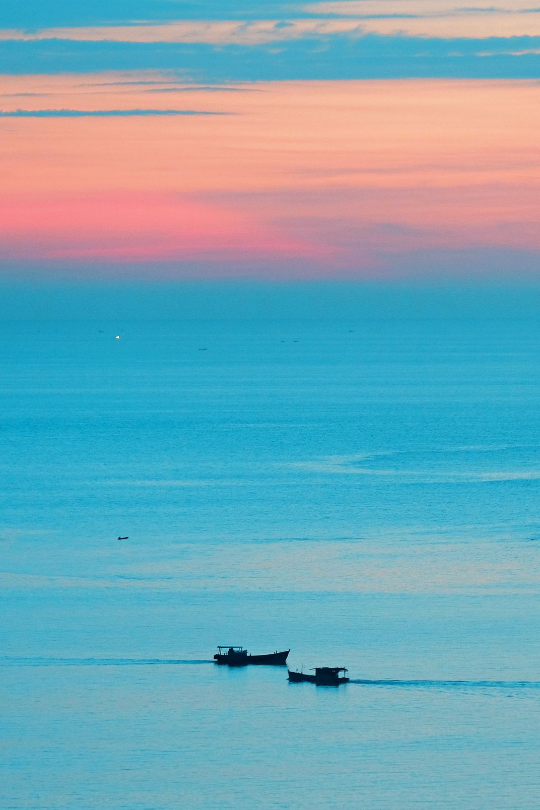 The two fishing boats in the sea beside go Ngapali beach , Myanmar. I feel the love scenery of the sea at the time of evening like a painting .