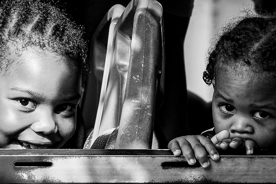 One child smiles with bright curiosity, while the other hides in silence. A single moment that captures the duality of innocence.