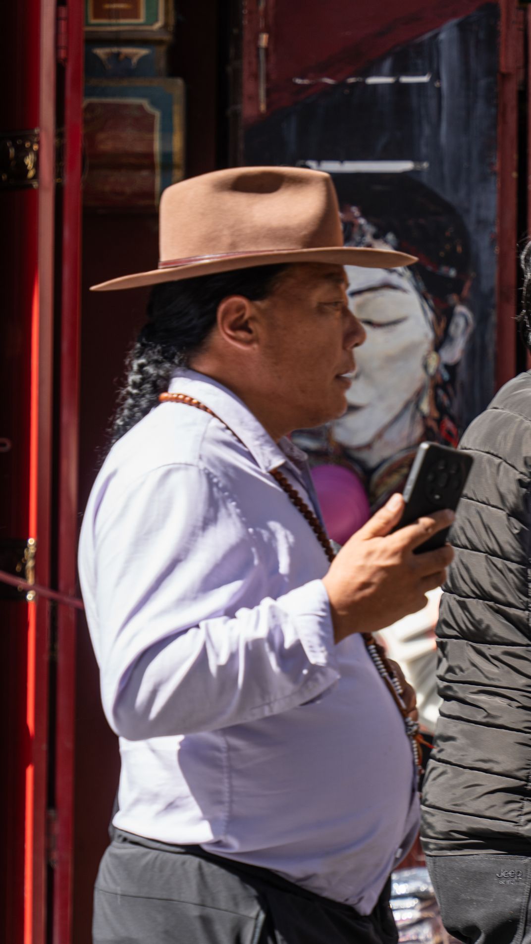 A Tibetan woman walking on Barkhor Street, whose face visually colides and overlaps with the half-face of a Tibetan female portrait in the background.