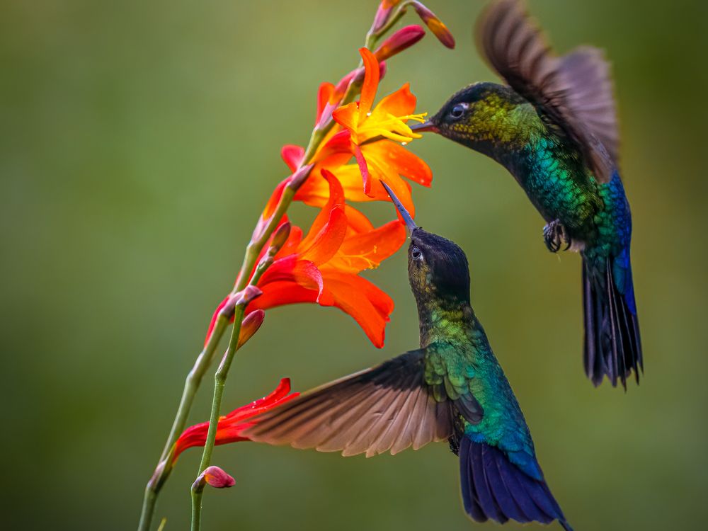 The shot was taken on the Osa peninsula in Costa Rica, There were several hummingbirds feeding on the same type of flowers. My objective was to capture two in the same frame.