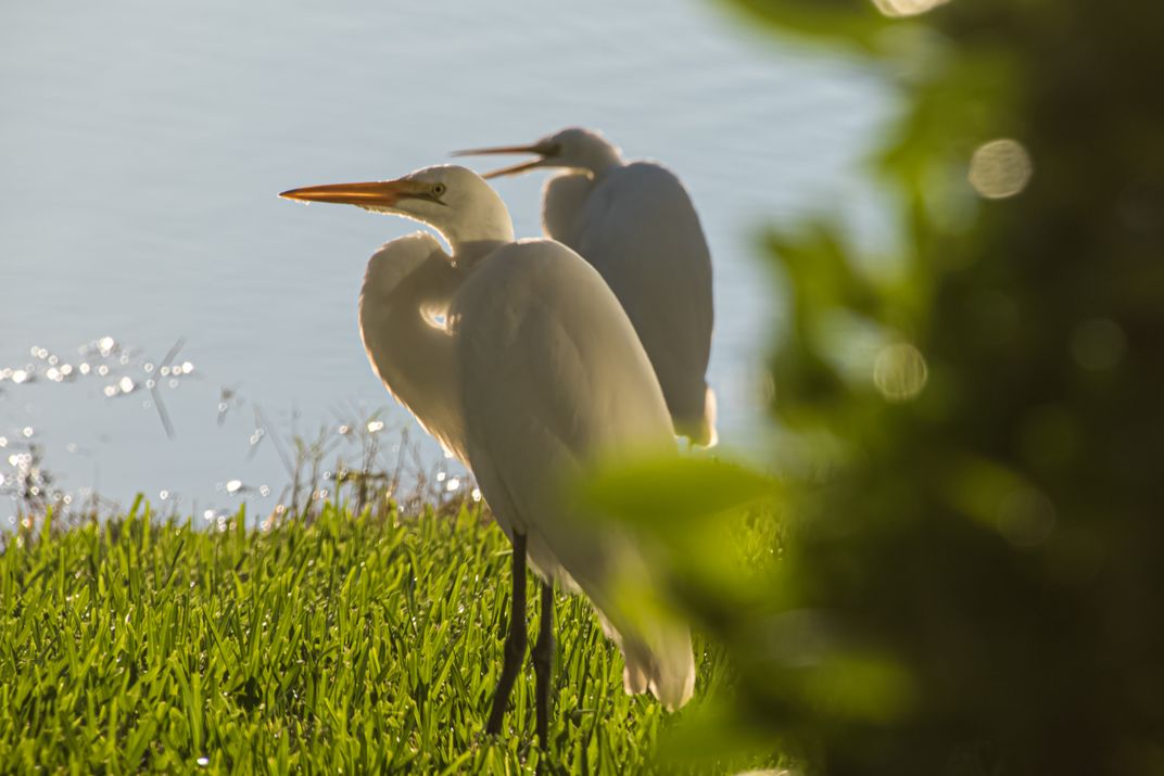 Two beautiful great egrets standing, by the lake, in the early morning sunlight.