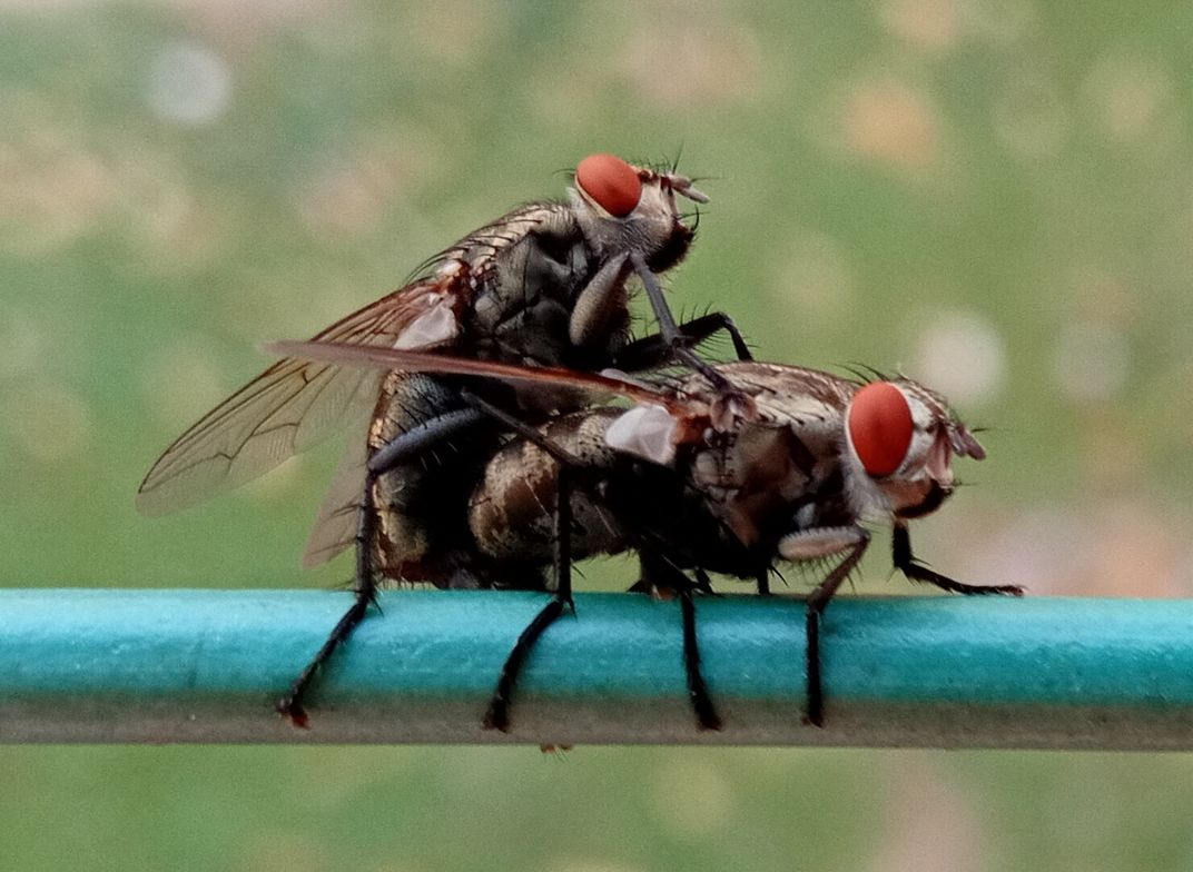 The housefly is a commonly found insect all over the world. They rapidly breed and are not just adapted to urban life, but prefer it.This photo is captured while they are mating.Houseflies are polygynous in nature. The males mate with multiple females. Females however choose only one male.