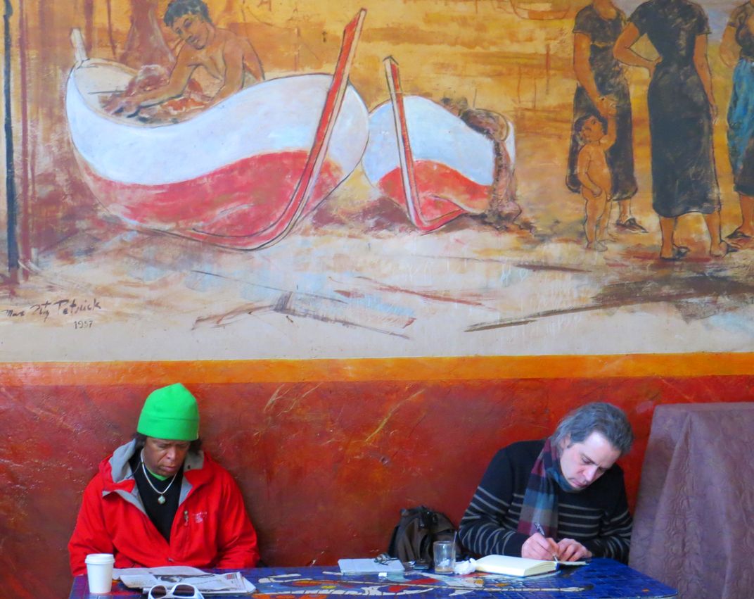 An interesting photo of opposites. Two men in the historical landmark... Cafe Trieste in San Francisco where Francis Ford Coppola wrote The Godfather screenplay. One is reading, one is writing, one is African American, one is Caucasian, one is in bright colors, one is in dark clothing.
