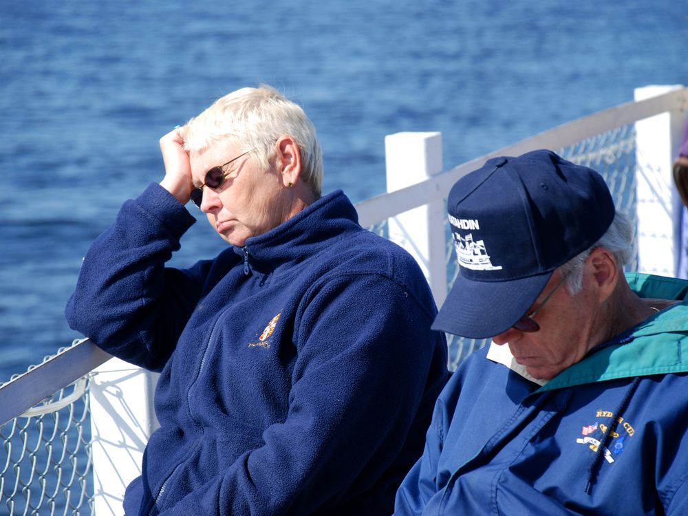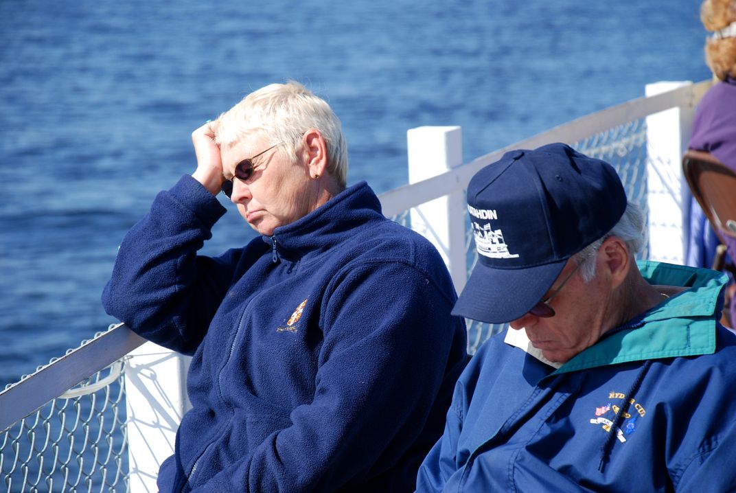 Two old folks sleeping on a boat on Moosehead Lake, Maine
