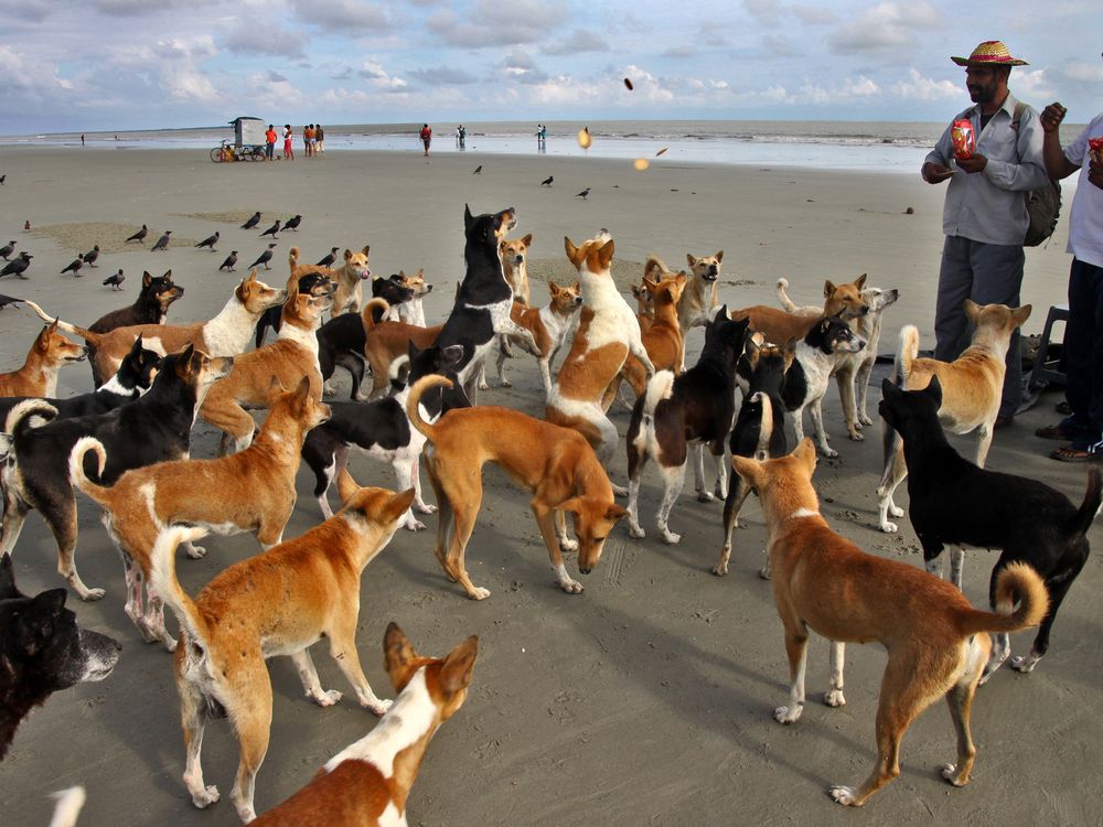 Two pilgrims at Gangasagar Island in West Bengal feeds the stray dogs.