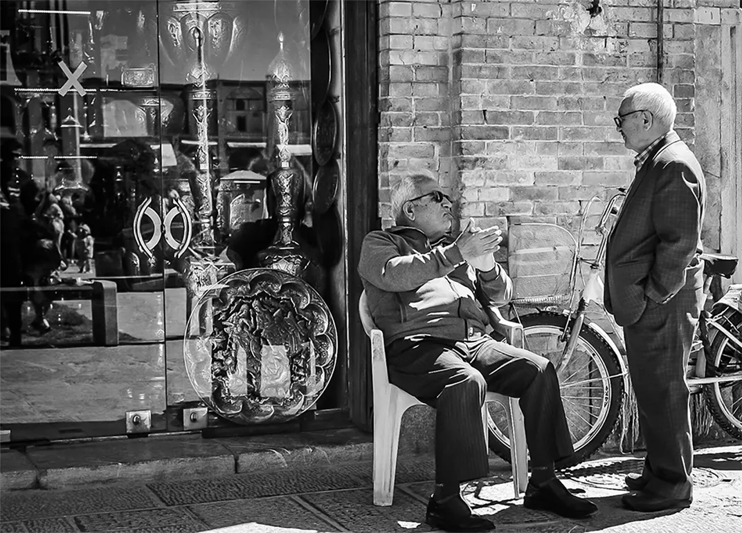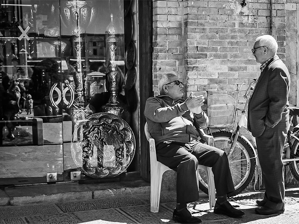 In the heart of Isfahan, next to one of the chambers of Naqsh-e Jahan Square, two men are engaged in conversation. One is sitting and attesting to a truth with his hands, while the other stands, looking on the verge of judgment and reflection.