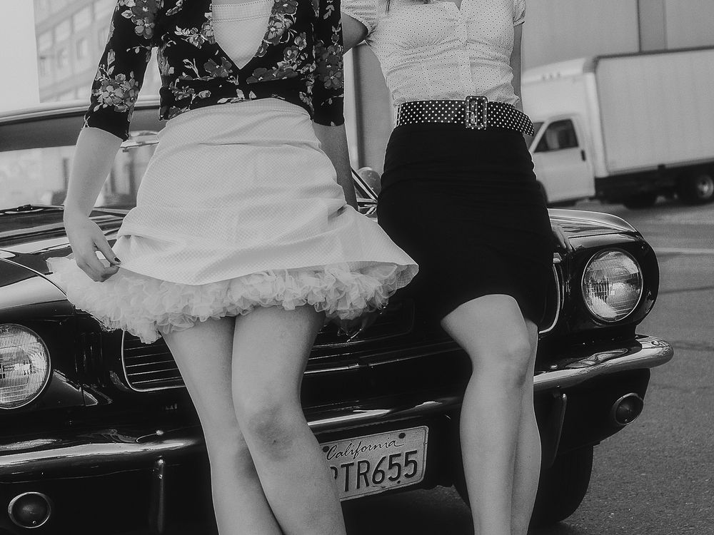 Captured during a photography session in the city’s industrial district, this photograph observes a spontaneous moment of shared humor and vintage style against the backdrop of everyday life.
