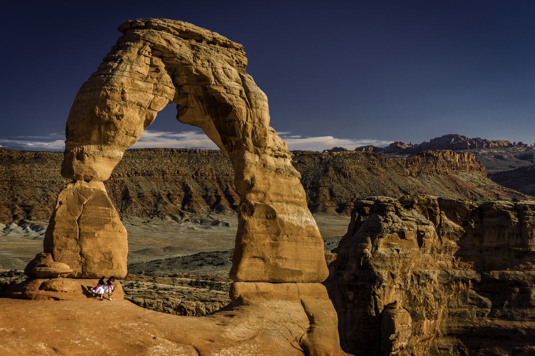 Two Native American women in costume at Delicate Arch in Arches National Park, Utah