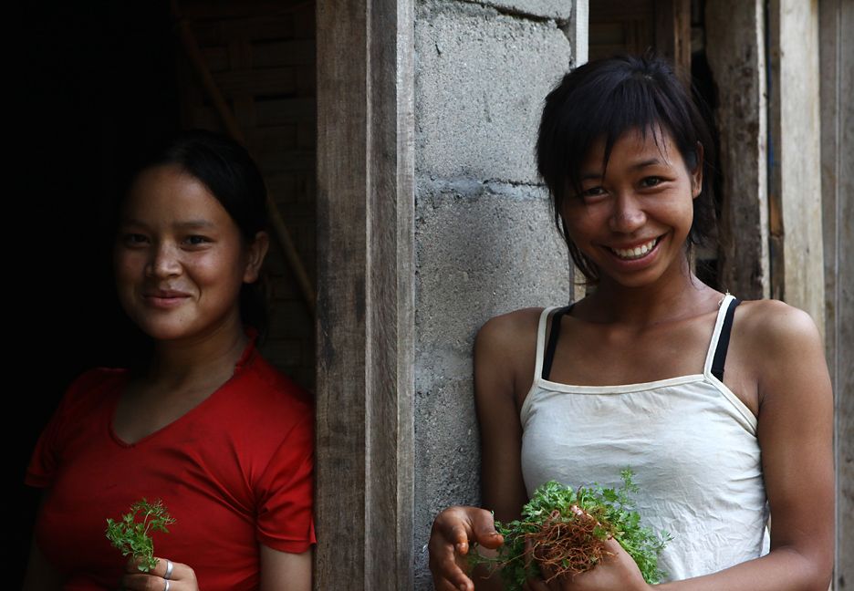 Two women pause from preparing dinner in a local village outside of Luang Prabang, Laos.