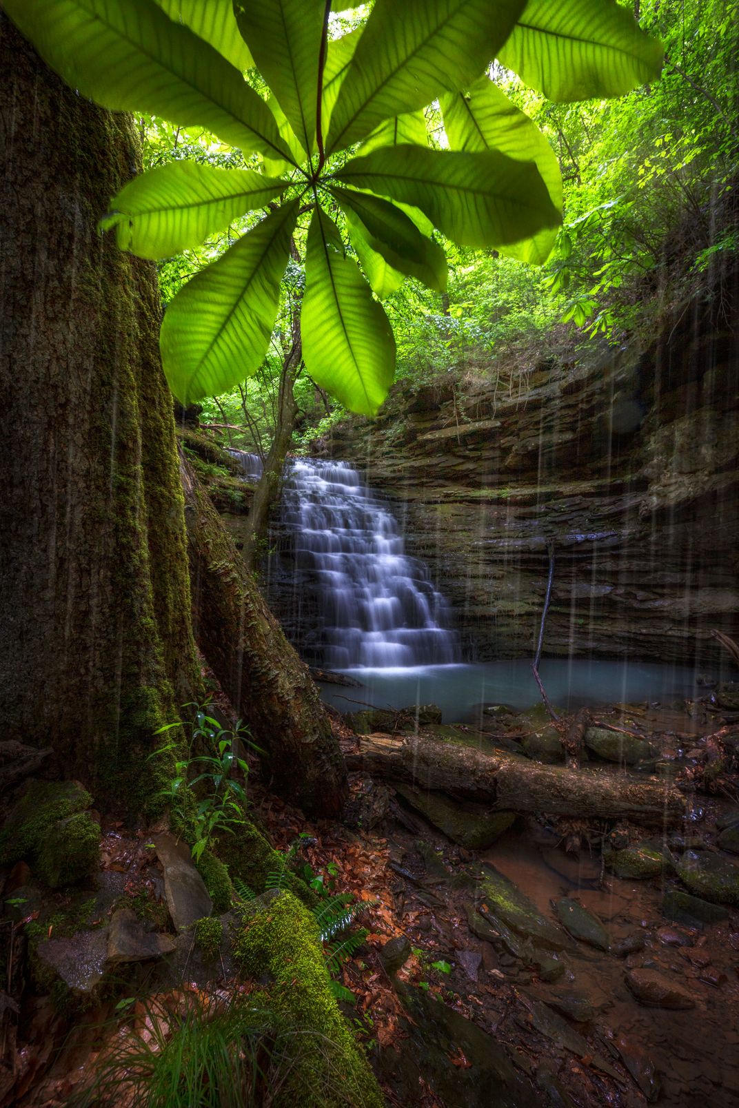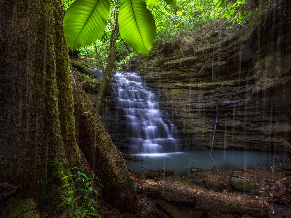 Owl Falls taken under an umbrella magnolia tree in the Ozark National Forest