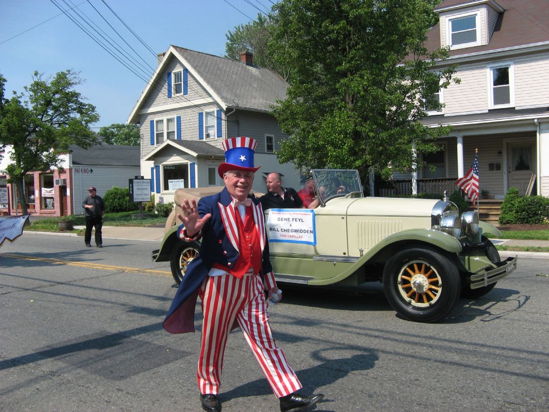 Uncle Sam walks and greets spectators at Memorial Day parade.