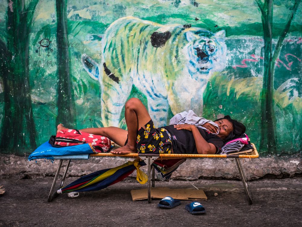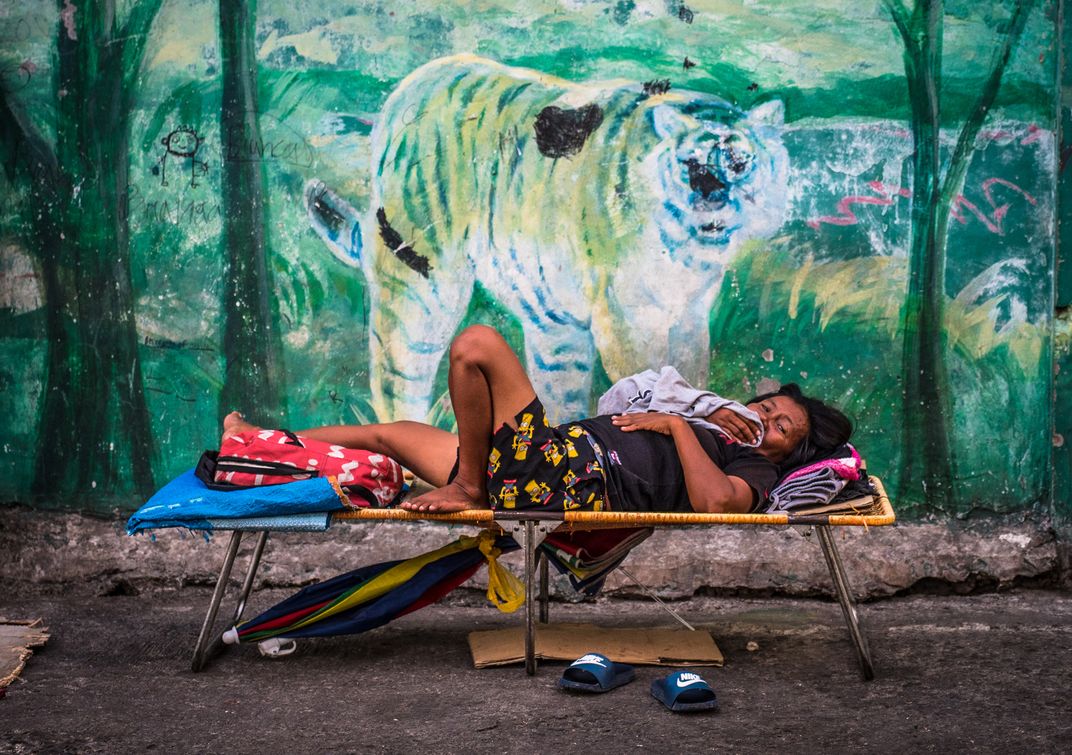 A woman sleeping under an image of a tiger in Cebu, Philippines
