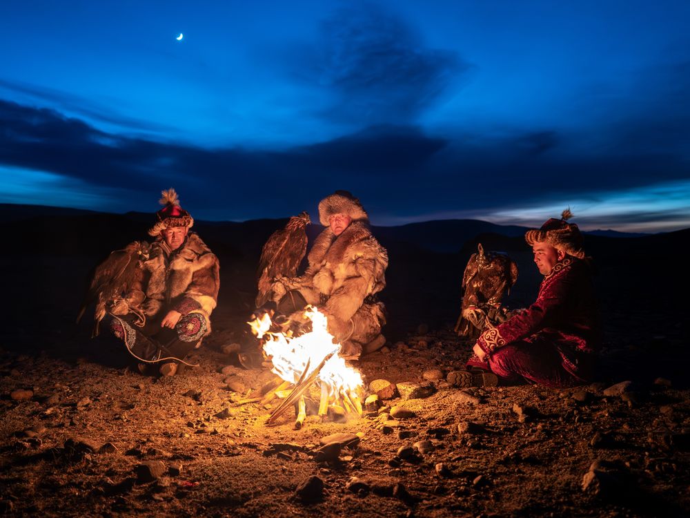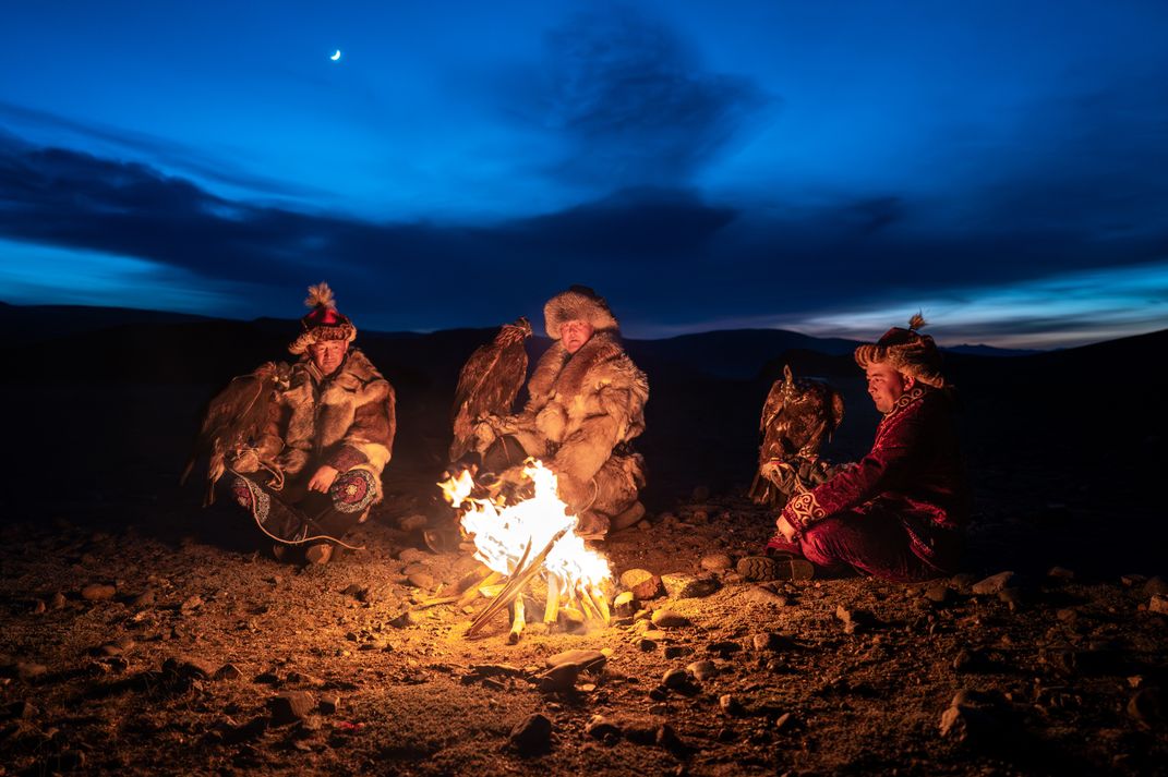 As night falls, eagle hunters gather around a fire beneath a crescent moon. Their faces glow in the warmth, their birds perched beside them — a ritual of endurance and belonging.