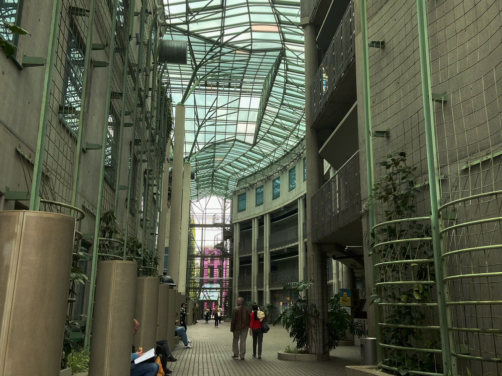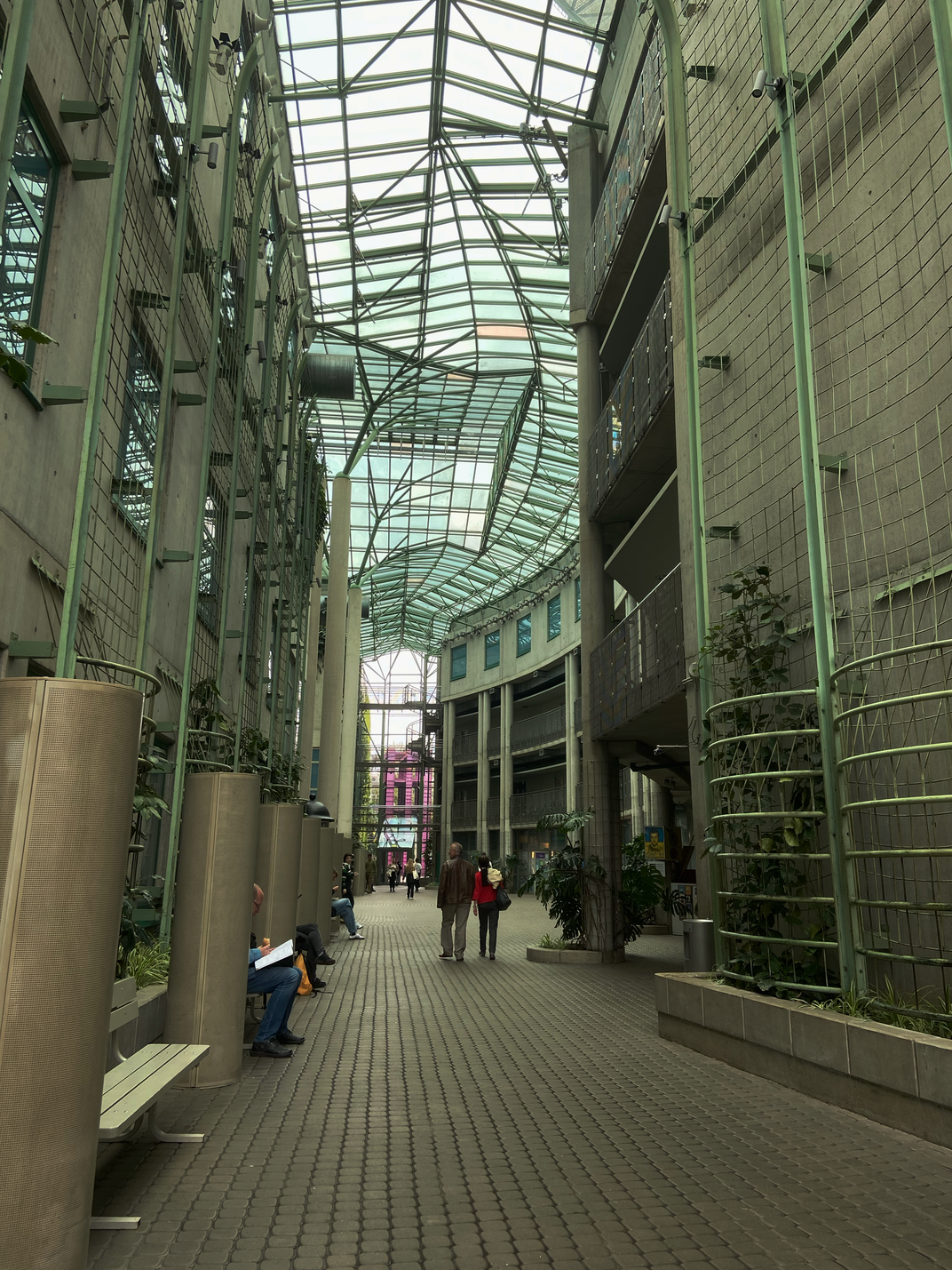 A quiet interior moment inside a modern atrium, where a geometric glass ceiling and pale green framework create a futuristic atmosphere. The long corridor and human scale emphasize depth and architecture.