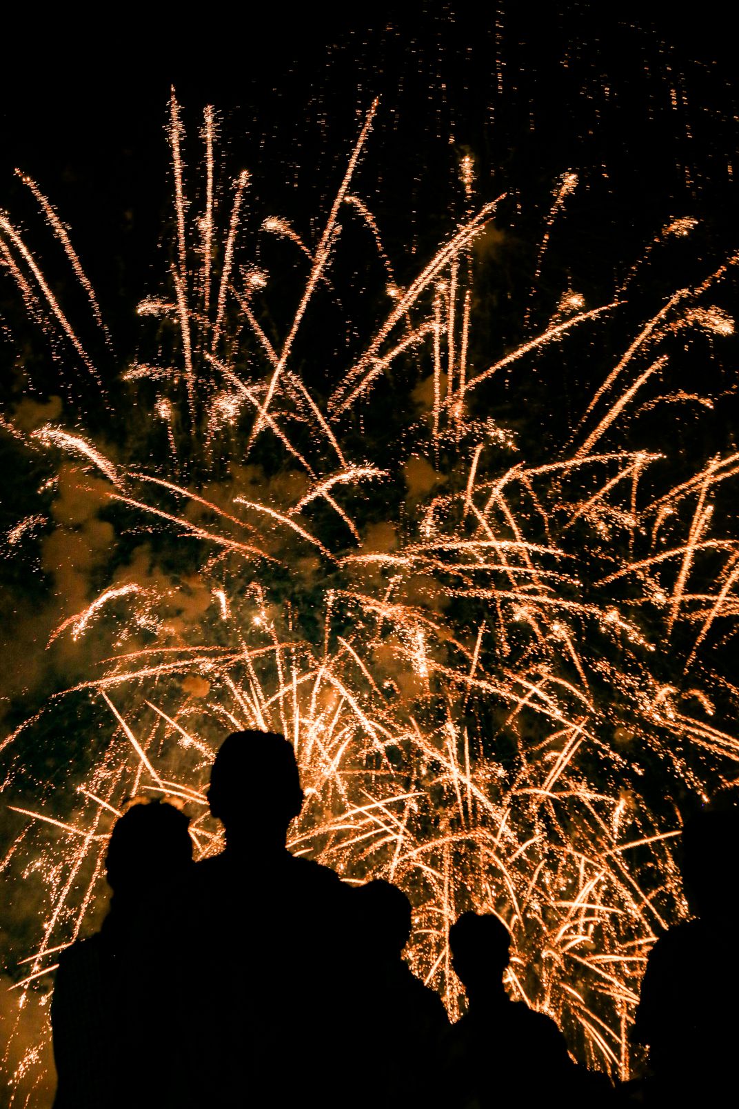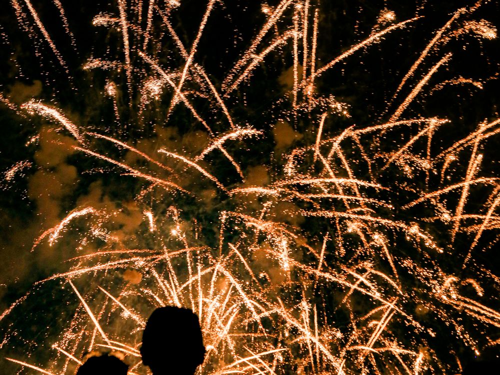 A crowd stands mesmerized as the night sky is completely filled with a dense, chaotic burst of golden fireworks. The silhouettes of spectators, heads tilted upwards, convey a shared moment of awe and wonder at the overwhelming display of light.