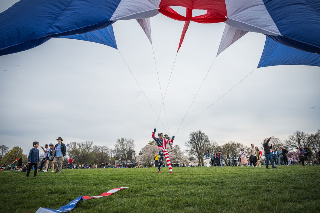 The Blossom Kite Festival is a popular event in Washington DC. Every year all the amateurs and professionals from around the country come to the National Mall. One of them is Darek. He is a veteran who decided to attend the event wearing patriotic clothes. His passion for kites is an inspiration for many people.