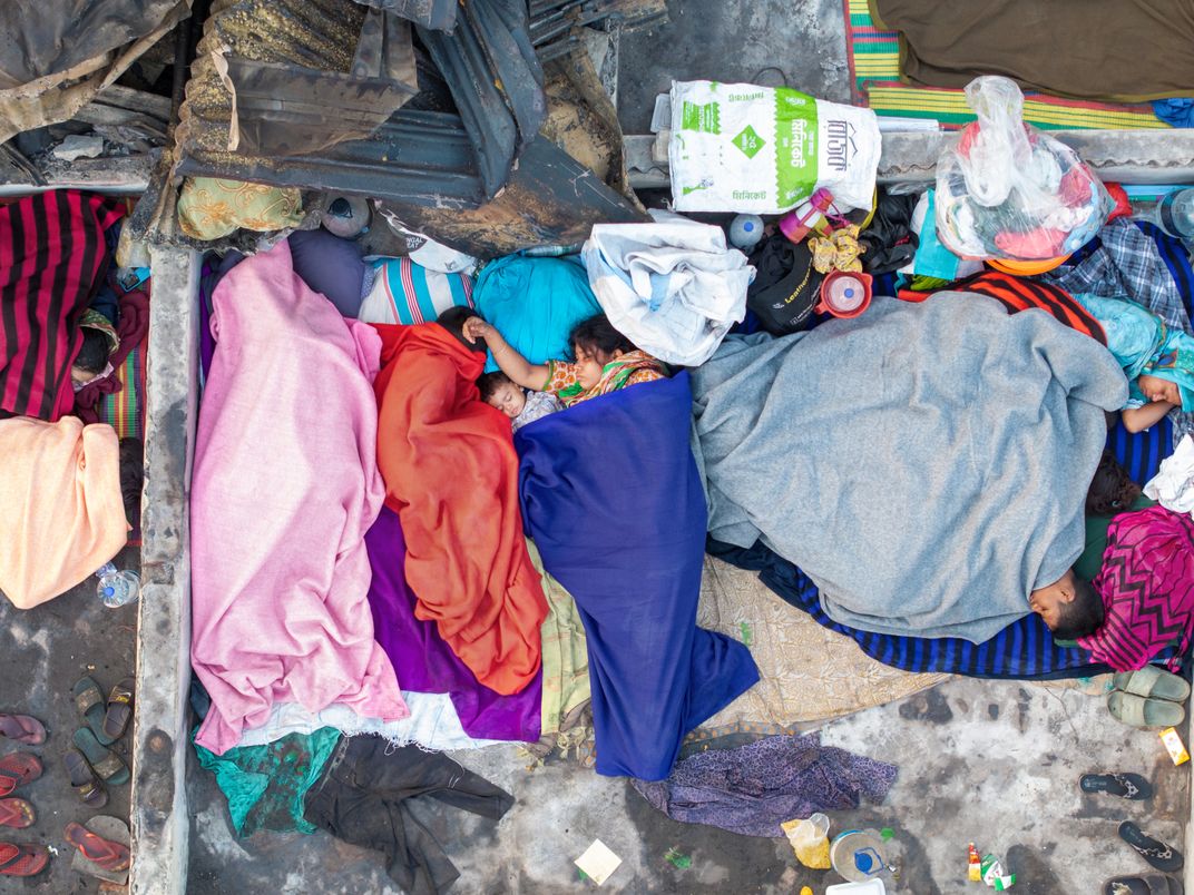 A family, with their little child at the center, sleeps under the vast open sky amidst the aftermath of the Korail fire. The child, nestled securely in the warmth of family, symbolizes hope and resilience, even in the face of overwhelming loss.