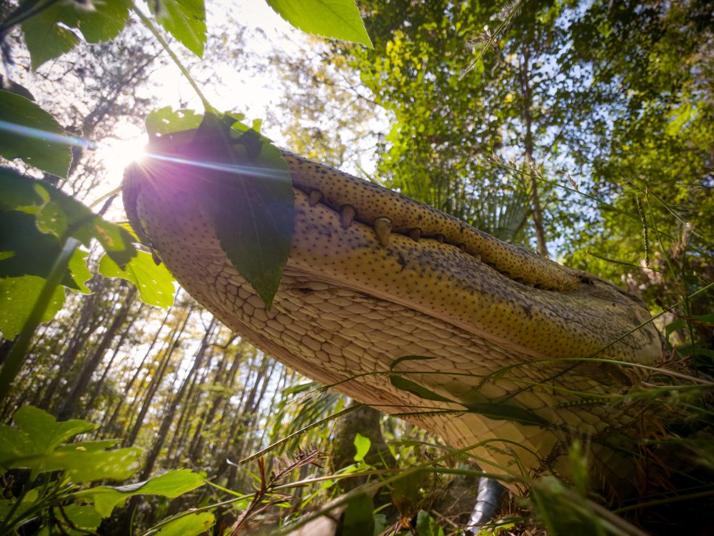 A wild alligator passed directly over my mobile phone as I used an ultra-wide lens pressed into the forest floor. Handheld and shot in real time with no burst mode, this single frame captures the moment from beneath its jaw.