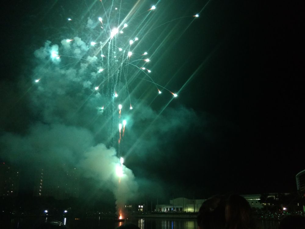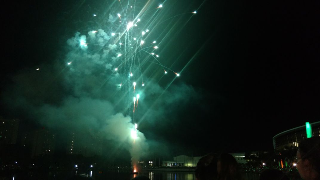 One of the homecoming traditions at the University of Miami is the boat burning and subsequent fireworks. This photo captures the end of a firework detonation with some of the original dorms to the left hand side of the photo and the new student center to the right side.