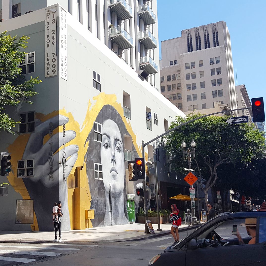 On South Spring Street, in Downtown Los Angeles, I and a car driver were taking the same photo (of the mural) at the same time. The manner in which the woman on the mural holds her hand seems to mimic or reflect the car driver holding his cellphone. The result is a frame-within-the frame construction which links both views (the driver in his car and the woman on the mural) that inspired my photo.