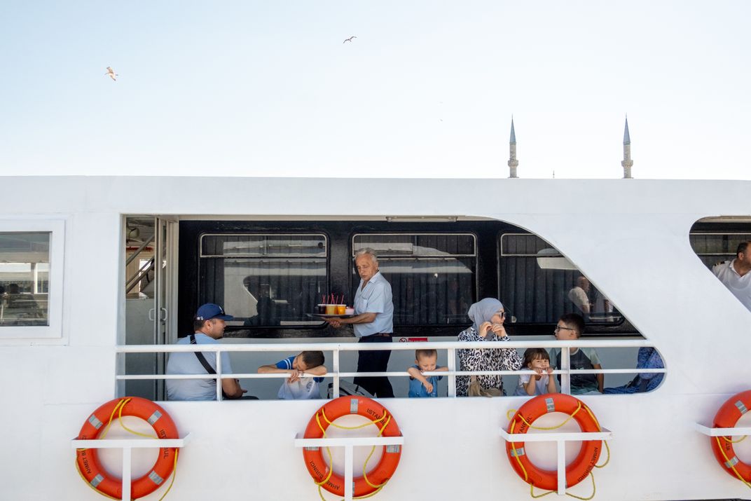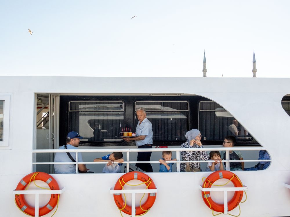 A family takes a ferry boat to the Eastern side of the Bosphorus