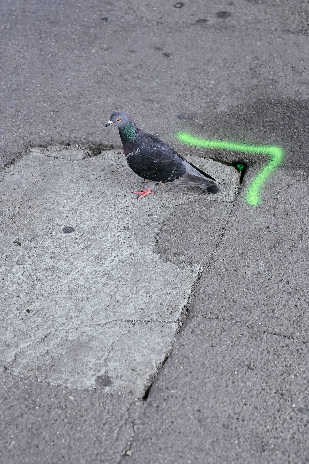 The photograph shows a pigeon at the train station of Stuttgart (Germany). A fluorescent mark behind it hints at the human presence, as does the concrete ground, forming an urban landscape.