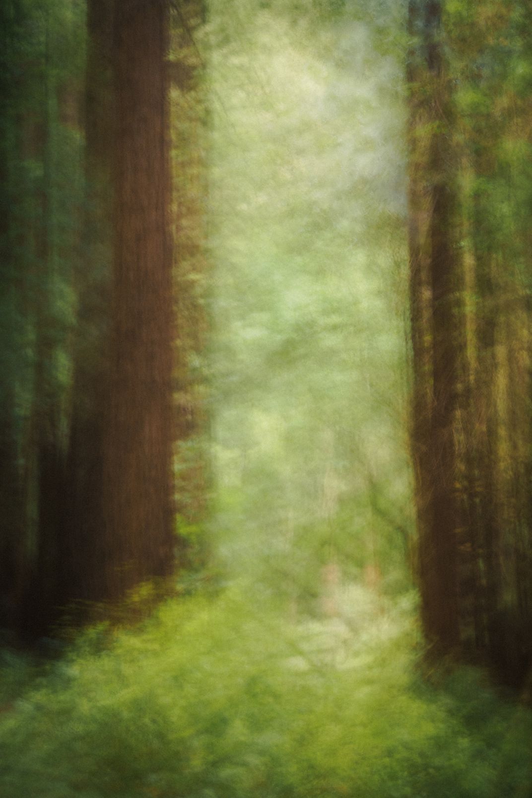 A contemporary photographic impression captured in-camera during a single exposure. The image is showcasing an abstract moment of a natural gateway created by redwood trees basking in radiating light surrounded by dense vegetation.